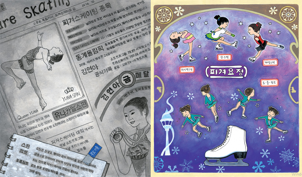 이번에 소개할 책 역시 저의 창작그림책인 [소원이는 피겨요정]입니다. 이 책은 피겨스케이트를 배우고 싶어 하는 아이의 이야기를 담은 내용인데요. 이 책을 처음 하려고 했을 때는 2010년 김연아 선수가 벤쿠버 올림픽에서 금메달을 따기 전으로 거슬러 올라가요. 당시만 해도 피겨스케이트를 다룬 어린이 책이 얼마 없을 때라 빨리 책을 만들고 싶었으나 앞서 소개해드린 [날아라, 뿔논병아리]를 먼저 작업하게 되고 그 책이 많은 취재와 노력을 필요로 했기 때문에 이 책도 자연스럽게 미뤄지게 되었어요.